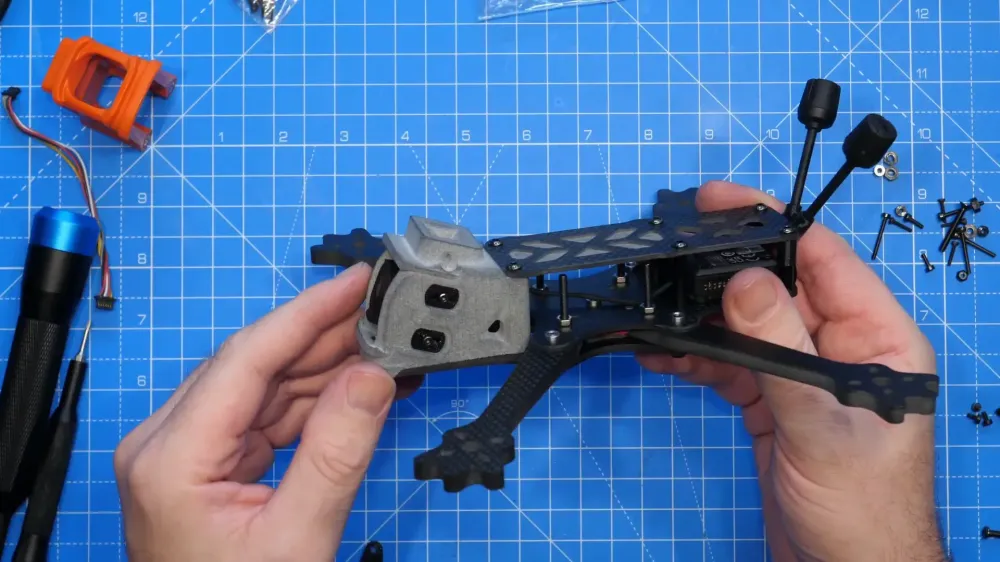 Ian walks through the assembly process, detailing the steps to put the frame together. He emphasizes the importance of inserting the press nuts for the carbon fiber plates before assembly, ensuring that the flight stack standoffs are in place early on. Here’s a quick rundown of the assembly: