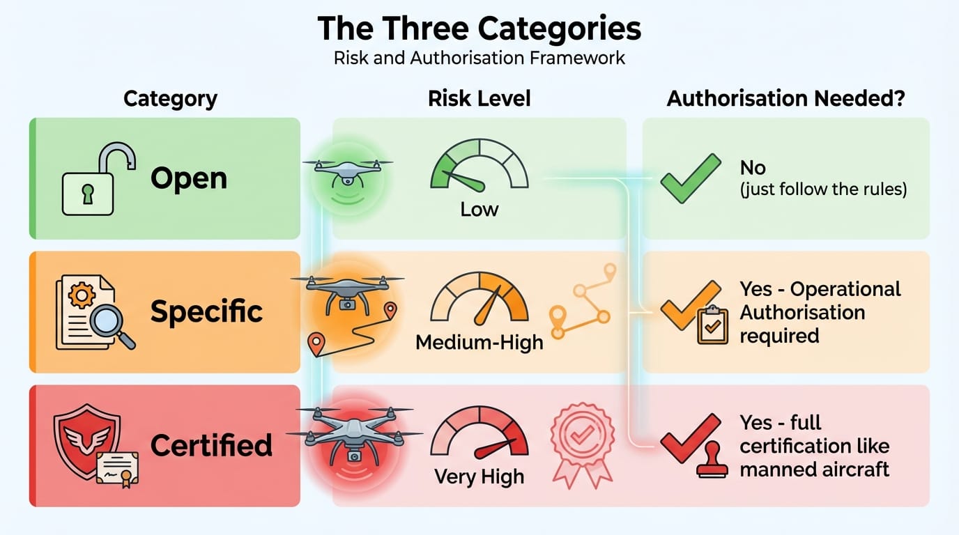 The CAA divides drone operations into three categories based on risk: