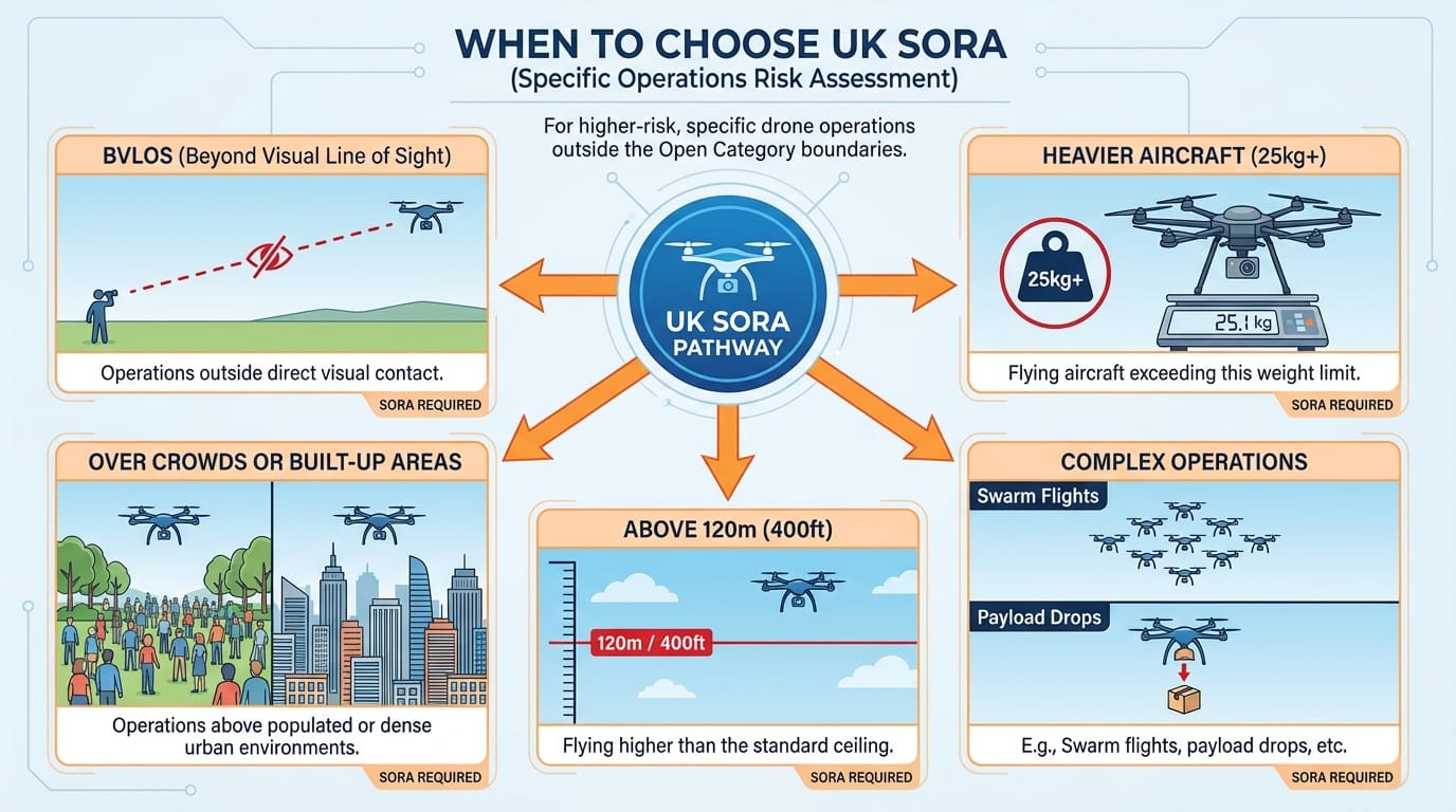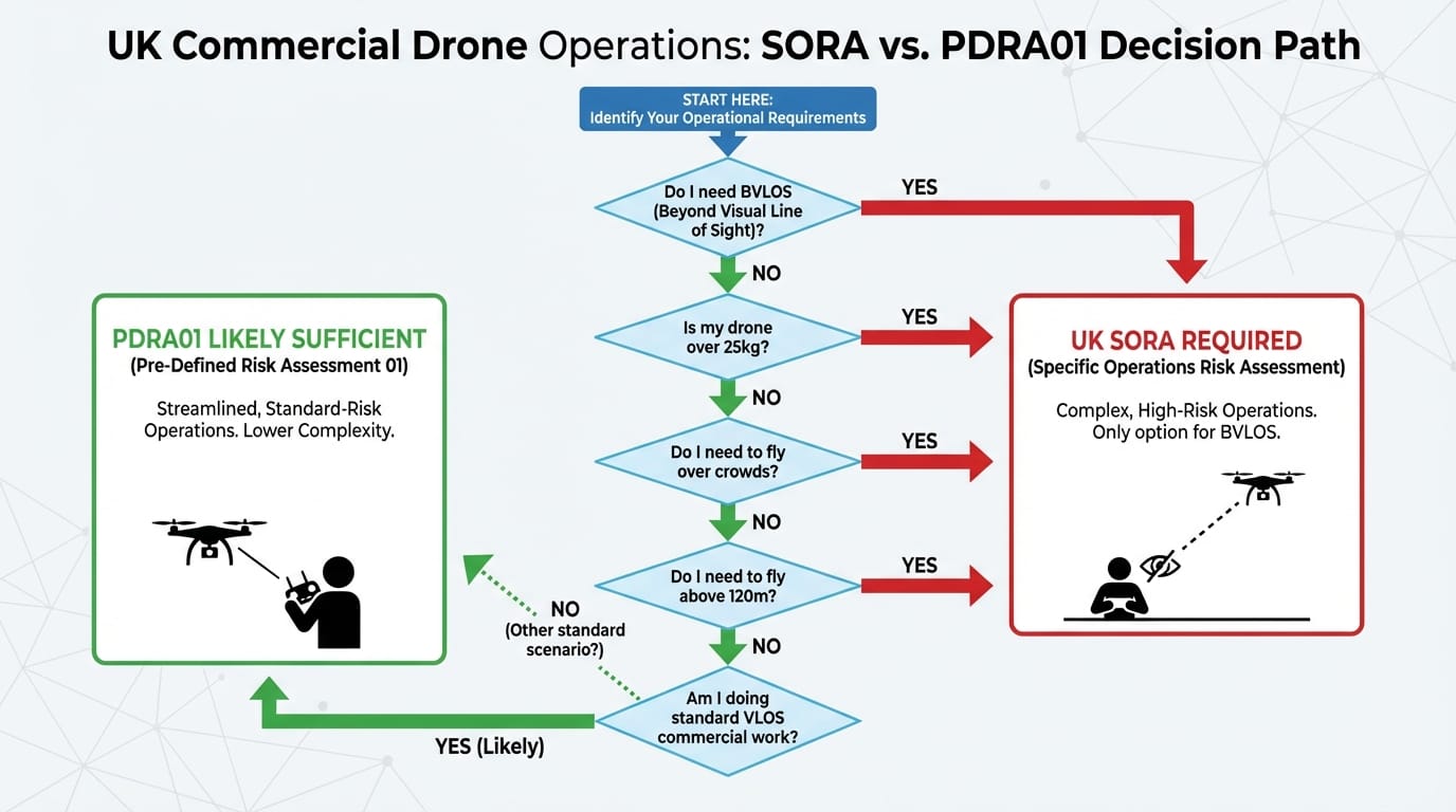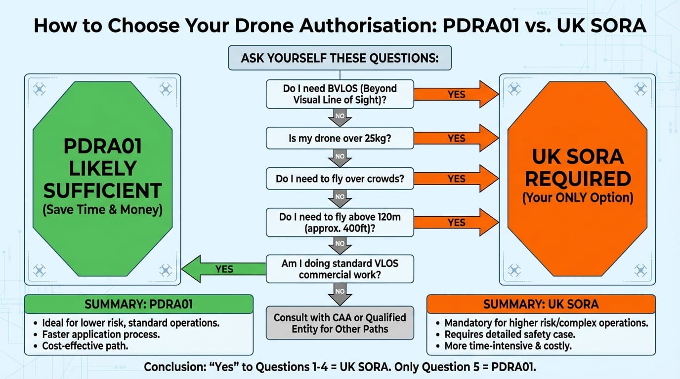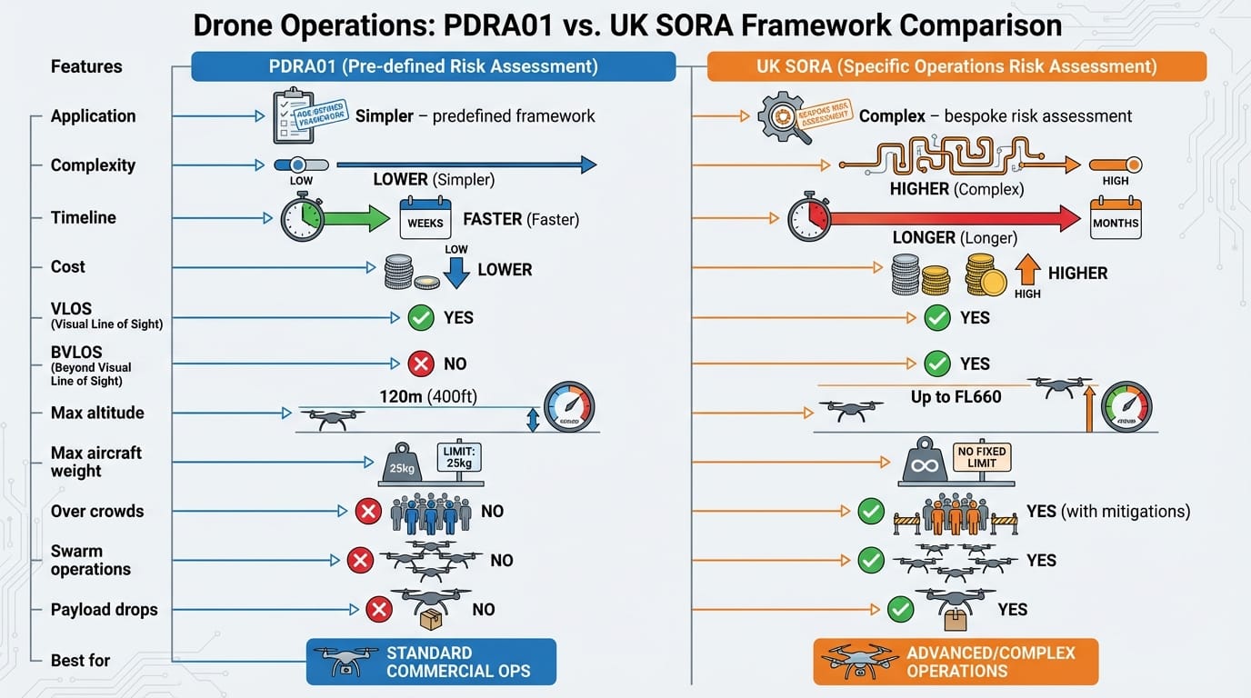 UK SORA is your pathway to advanced operations. It costs more and takes longer, but unlocks BVLOS, heavy-lift, crowd overflight, and other capabilities that PDRA01 can't touch.