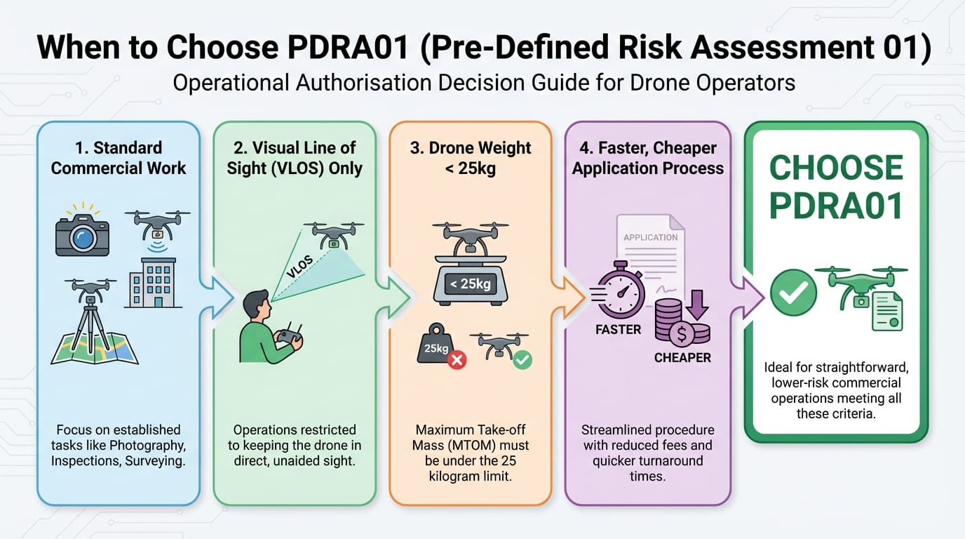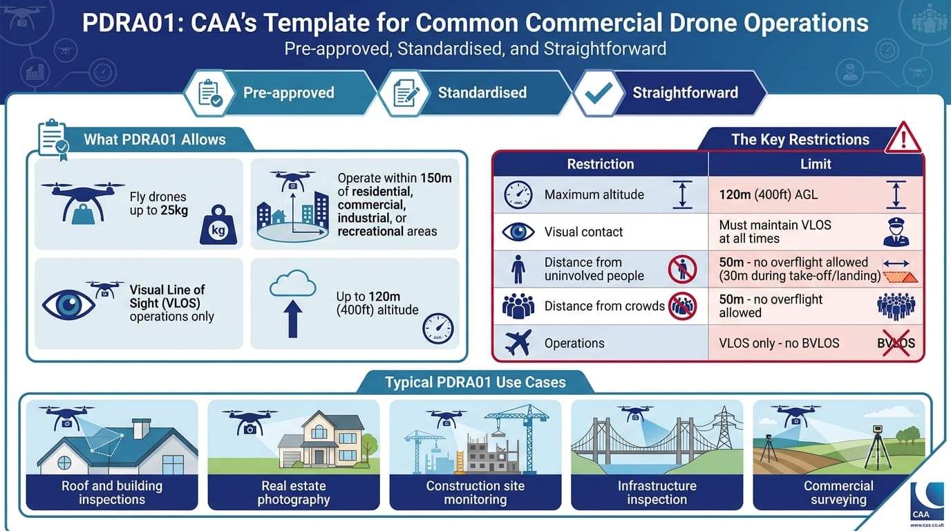 PDRA01 (Pre-Defined Risk Assessment 01) is the CAA's template for common commercial drone operations. It's pre-approved, standardised, and designed to be straightforward.