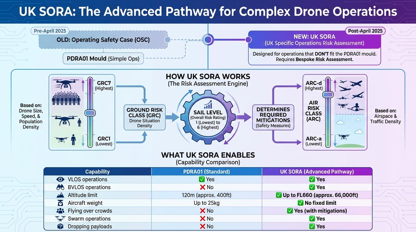 UK SORA (UK Specific Operations Risk Assessment) replaced the old Operating Safety Case (OSC) system in April 2025. It's designed for operations that don't fit the PDRA01 mould.